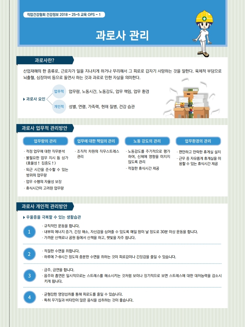 사업장은 물론 모든 노동자분들도 과로 예방의 필요성을 인식하고 스스로 건강관리를 해나갈 수 있도록 하여